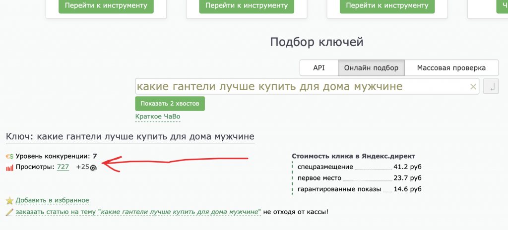 Допустим, мы продолжаем раскручивать сайт на спортивную тематику. Мы хотим написать статьи про выбор гантелей. И сначала нам надо подобрать правильный ключевой запрос, под который мы будем писать статью.