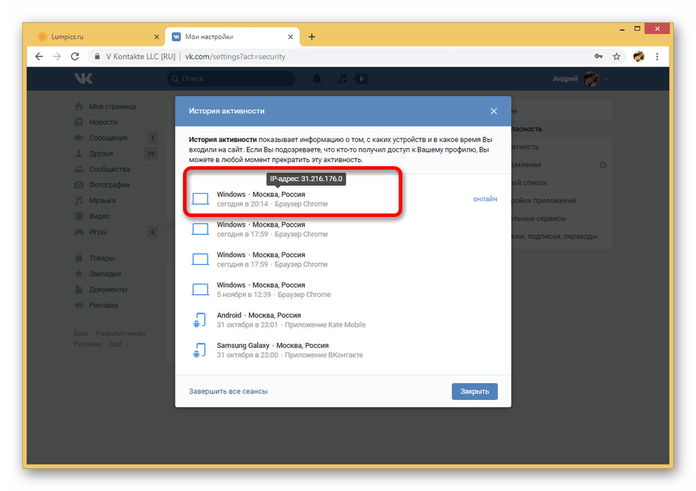 Если вы имеете доступ к учетной записи человека, то есть можете произвести авторизацию и воспользоваться внутренними настройками, вполне можно узнать IP-адрес владельца. Это же, в свою очередь, может быть использовано для реализации многих других задач, включая распознавание физического местоположения. Более подробно метод идентификации IP-адреса был нами описан в другой инструкции на сайте.