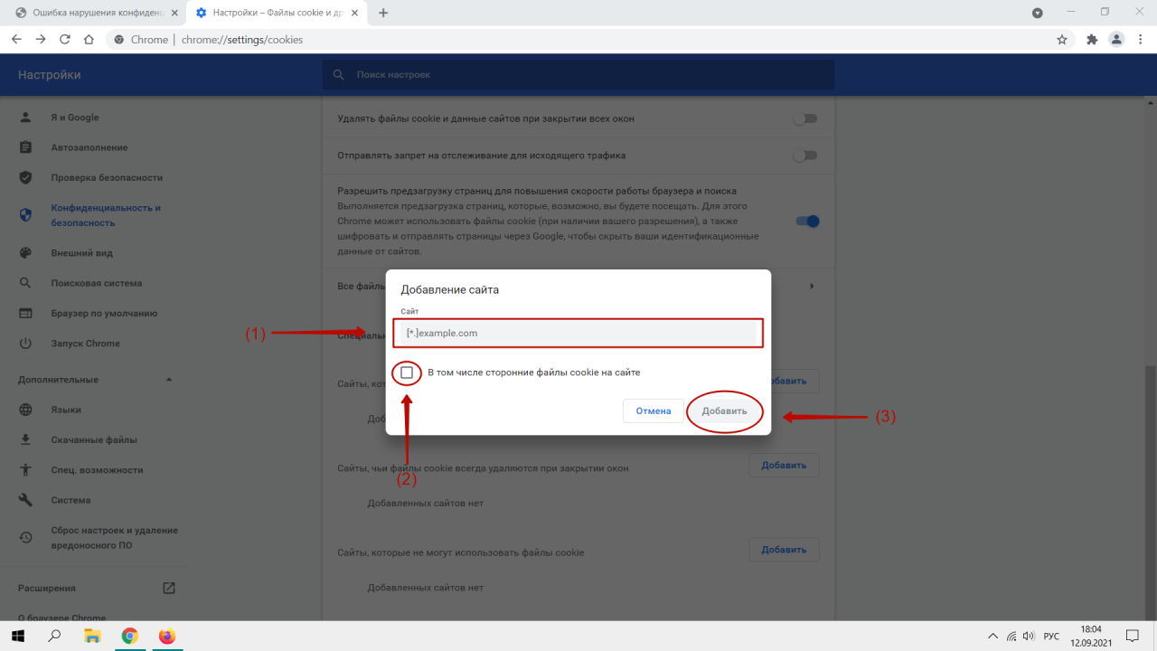 Теперь в пустое поле вводим адрес площадки (1), снимаем галочку с «Для всех сайтов этой зоны… (https:)» и добавляем к общему списку (2).