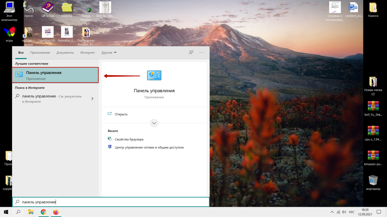 В Win 10 кликаем по значку поиска (иконка лупы), вводим «Панель управления» и нажимаем на него.