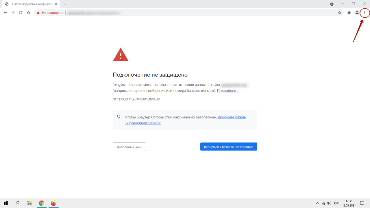 - во всплывающим уведомлении под адресной строкой нажать «Продолжить открытие этого веб-узла (не рекомендуется)»;
