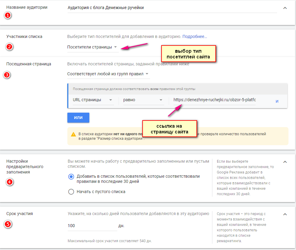 По аналогии с ретаргетингом на канале Ютуб требуется указать Настройки предварительного заполнения — 30 дней или новый список. Срок участия — максимум 540 дней. Описание для аудитории добавлять необязательно.