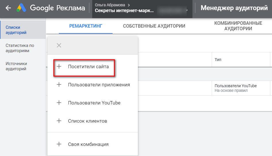 Второй вид ретаргетинга на ютуб, тоже, на мой взгляд, один из самых интересных — это создание аудиторий пользователей, посетивших ваш сайт или его целевые страницы.