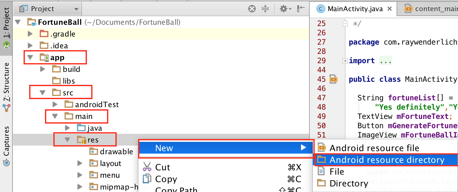 В разработке приложения под Android важна интеграция с другими ресурсами: изображения, кастомные шрифты, звуки, видео и пр. Эти ресурсы импортируются в Android Studio и помещаются в соответствующие папки, что позволяет операционной системе подбирать корректные ресурсы для приложения. Для нашего приложения Fortune Ball понадобится импорт изображений в папки drawable. В этих папках могут содержаться изображения или специальные файлы XML drawables (т. е. вы можете рисовать формы с помощью XML-кода и использовать их в своих макетах).