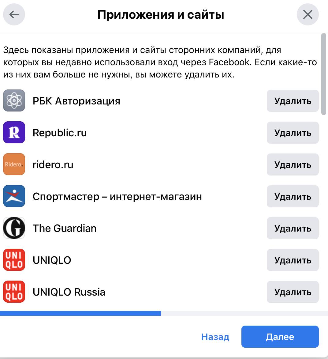 Нажмите напротив каждого «Удалить», проставьте галку в первом пункте и подтвердите. Так вы ограничите взаимное отслеживание вашего трафика между Facebook и сторонними сайтами.