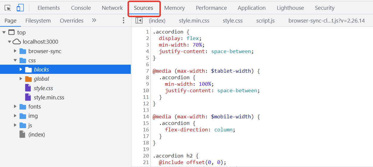 Порой разработчикам нужно проверить подключенные к проекту файлы и посмотреть их содержимое. В таких случаях на помощь приходит вкладка Sources: