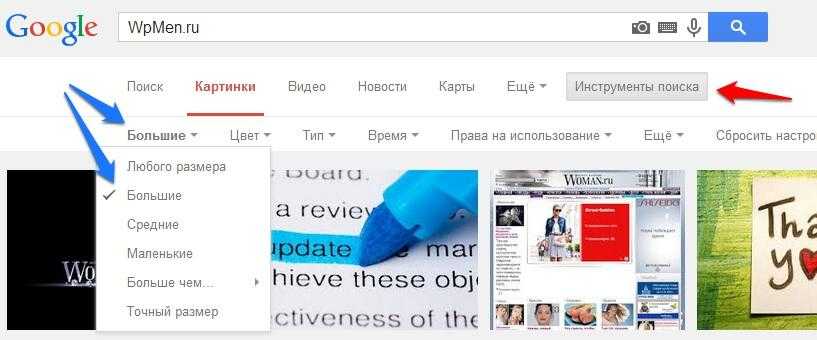 Для этого после ввода ключевого слова, переходим в «Инструменты поиска», далее в «Размер» и выбираем «Большие» (Не можете найти? Пройдите знакомство с текстовым редактором WordPress). После чего выдача поменяется и из нее будут удалены все маленькие картинки. Аналогичные действия проводятся и в поиске картинок в Яндексе…