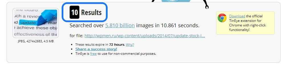 После чего сайт немного поработает и выдаст вам результат. Как видно ниже на картинке, мой результат — 10. Это не очень хороший показатель, нужно стараться искать картинки, которые имеют показатель не выше 3-5. Но 10 — еще приемлемо, бывает и 70, и 80, и 100. Так же ниже вы можете посмотреть все сайты вместе ссылками, на которых встречается ваше изображение.
