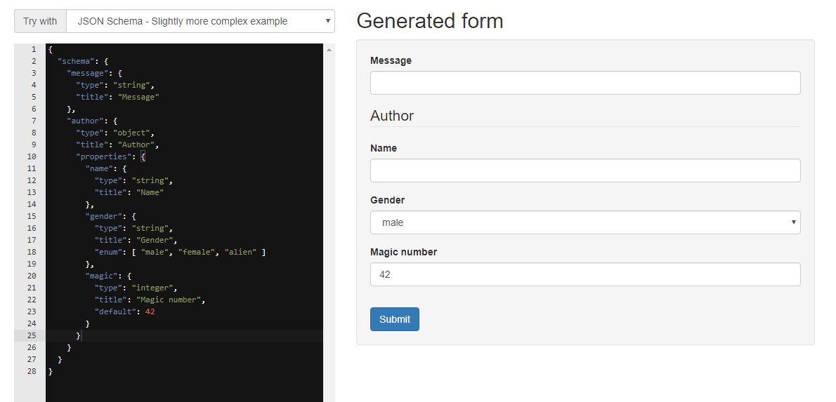 { «schema»: { «message»: { «type»: «string», «title»: «Сообщение» }, «author»: { «type»: «object», «title»: «Автор», «properties»: { «name»: { «type»: «string», «title»: «Имя» }, «gender»: { «type»: «string», «title»: «Пол», «enum»: } «magic»: { «type»: «integer», «title»: «Магический номер», «default»: 42 } } } }}