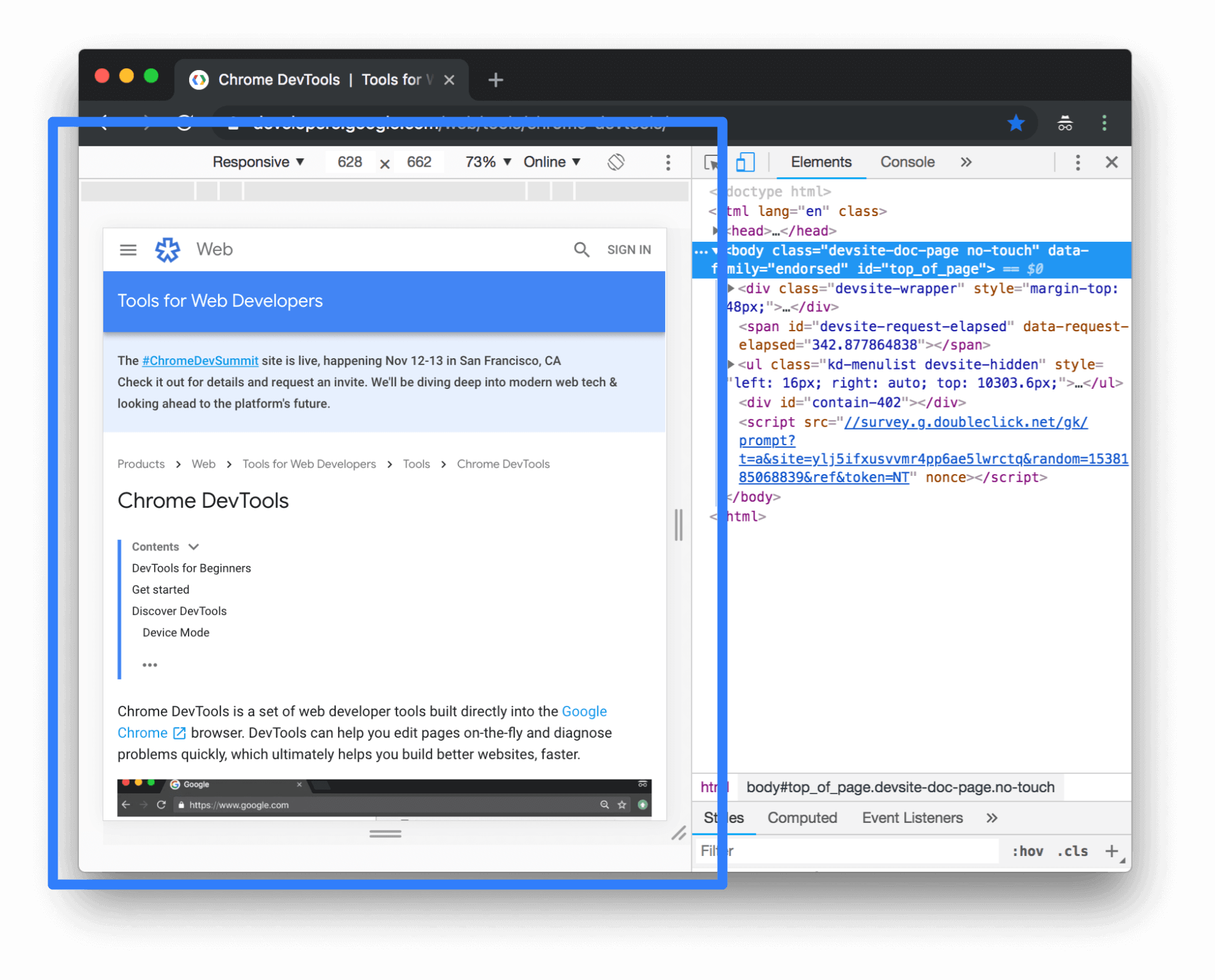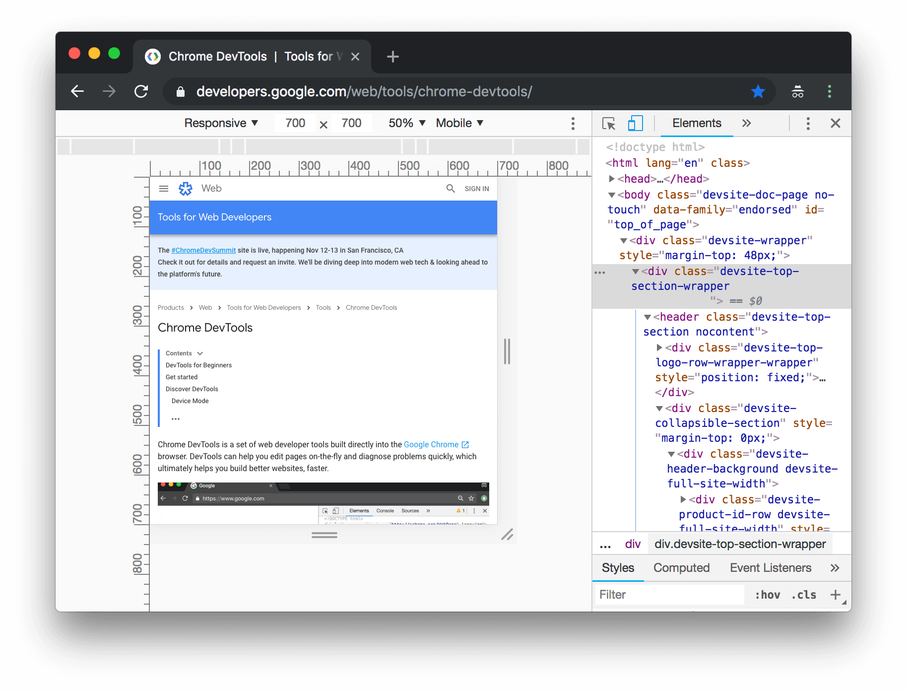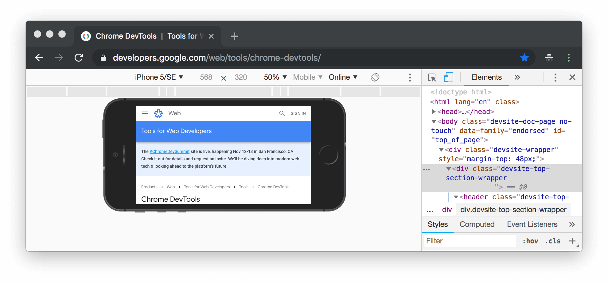 Click Toggle Device Toolbar to open the UI that enables you to simulate a mobile viewport.