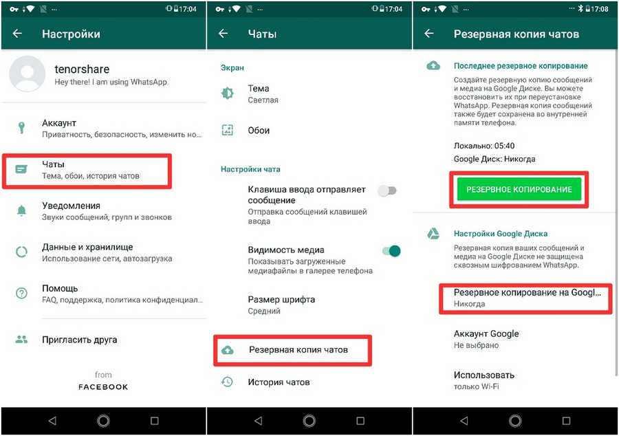 - последовательно нажимают на открывающиеся клавиши — «Чаты», «Резервная копия чатов», «Резервное копирование»;