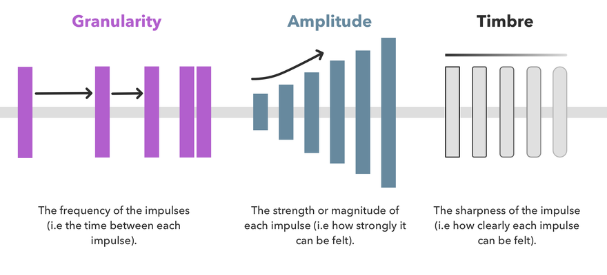 Дальше мы можем регулировать гранулярность, амплитуду и тембр тактильного фидбека, чтобы обозначать различное семантическое значение для переходных и непрерывных событий.