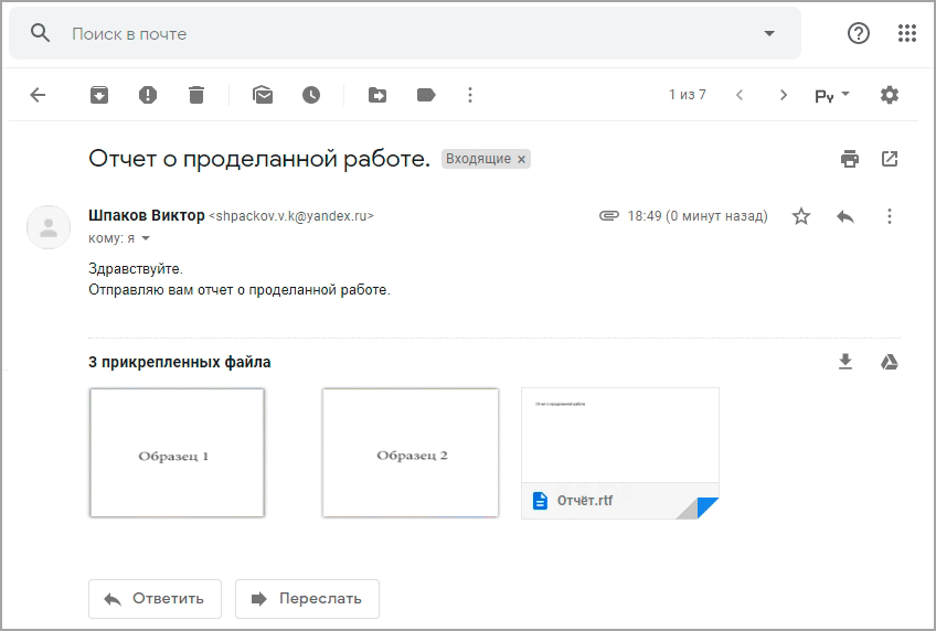 6. Щелкните «Отправить» и письмо с вложениями уйдет по адресу. Вот в каком виде оно поступит: