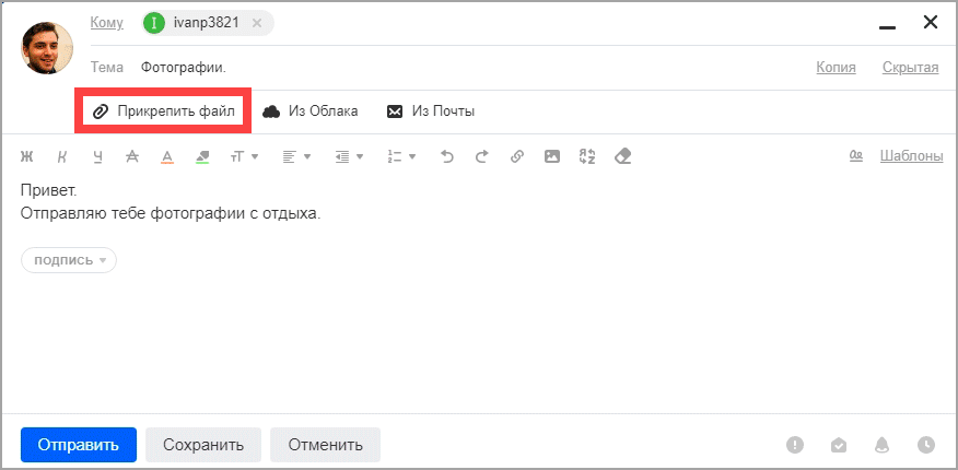 2. Заполните форму, как мы это делали ранее. Чтобы прикрепить файл, щелкните по иконке скрепки справа от кнопки «Отправить».