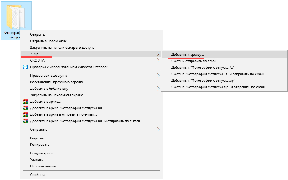 Щелкните по папке с нужными файлами правой кнопкой мыши. Выберите пункт «Добавить в архив».