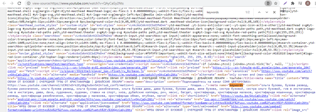 В открывшейся вкладке вызовите строку поиска сочетанием клавиш Ctrl + F и укажите «keywords». А потом наслаждайтесь результатом — все теги этого видео будут видны на экране, после подсвеченного словосочетания.