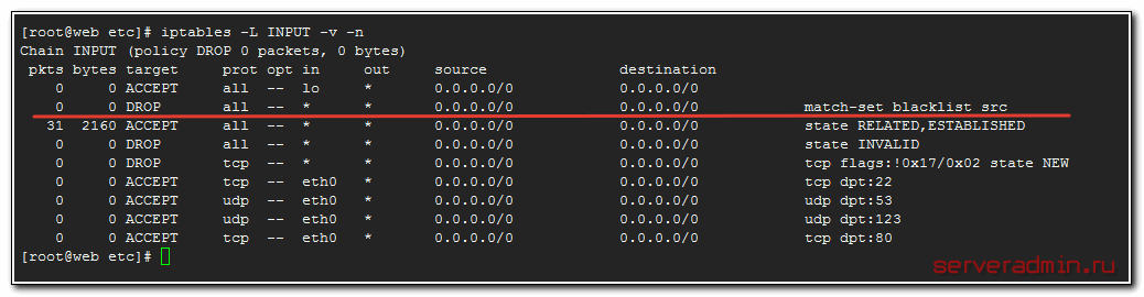 Список мы создали, теперь его надо подключить в iptables. Для этого добавляем правило блокировки.