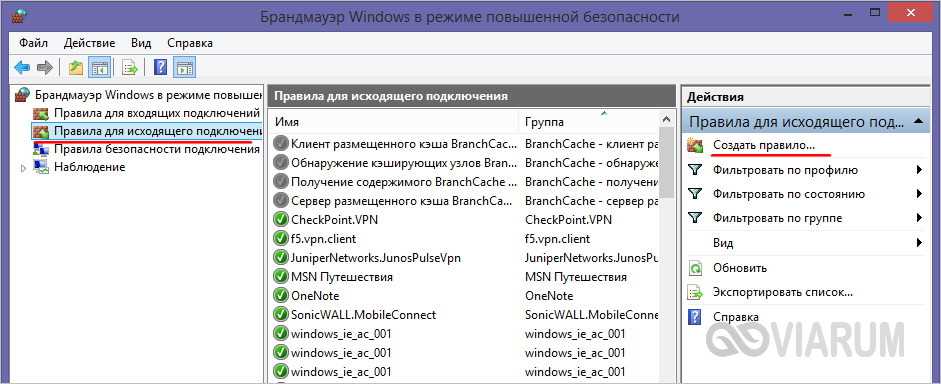 Далее нажмите в левой колонке ссылку «Правила для исходящего подключения», а затем «Создать правило», но уже в правой колонке.