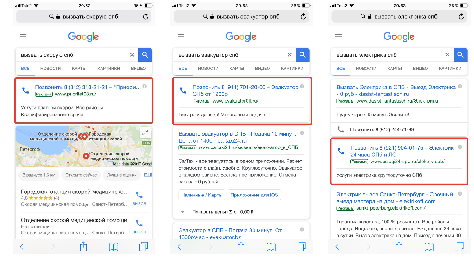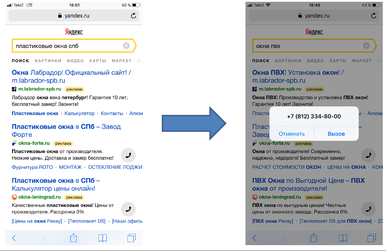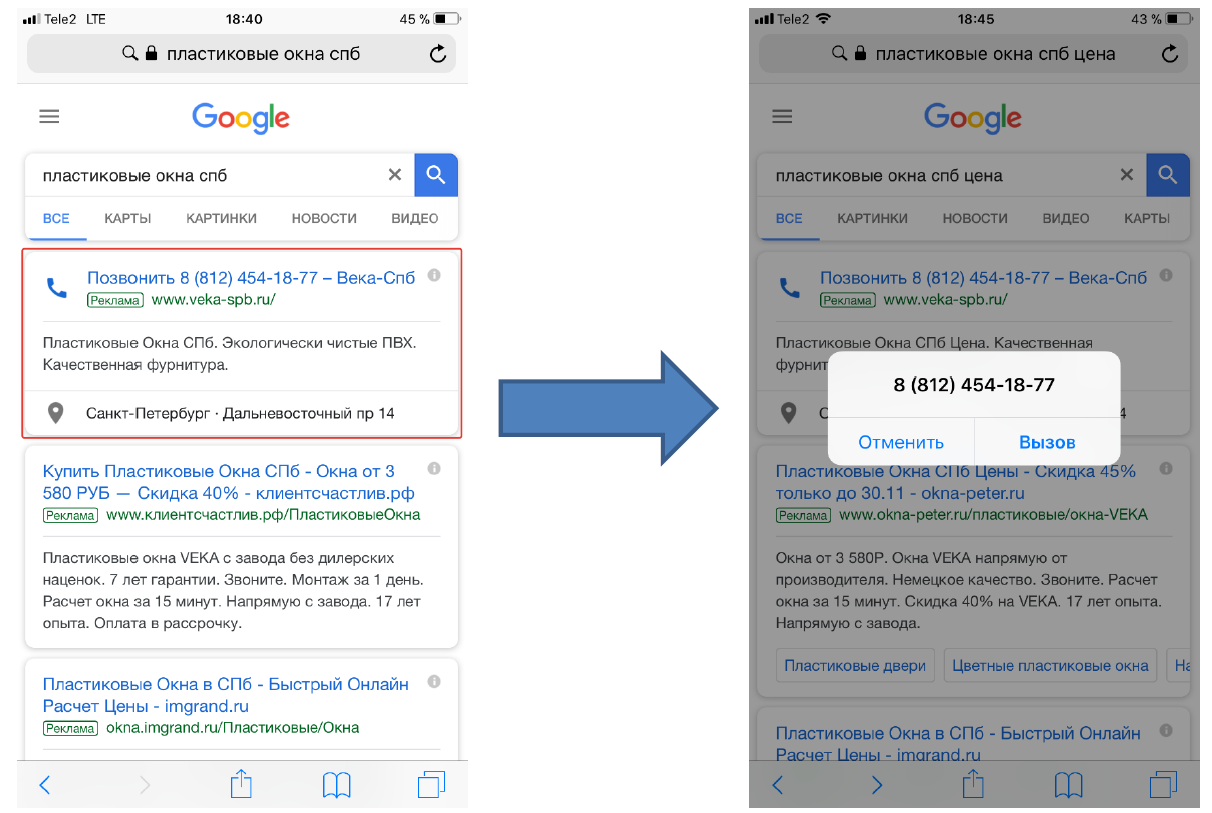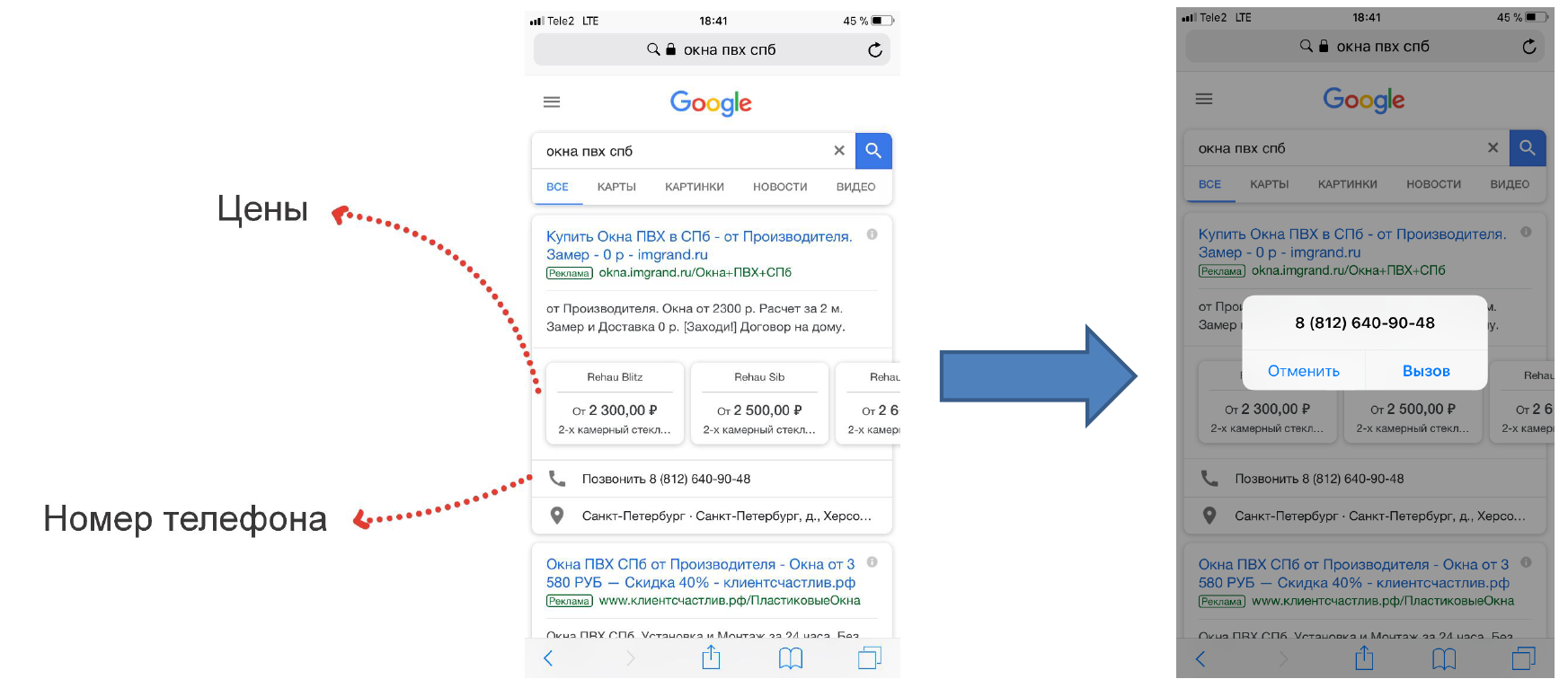 - Пользователь не ожидает, что после клика по объявлению он попадет не на сайт, а в функцию набора номера и звонка. Это нетипичный сценарий взаимодействия с рекламой, который может многих отпугнуть.