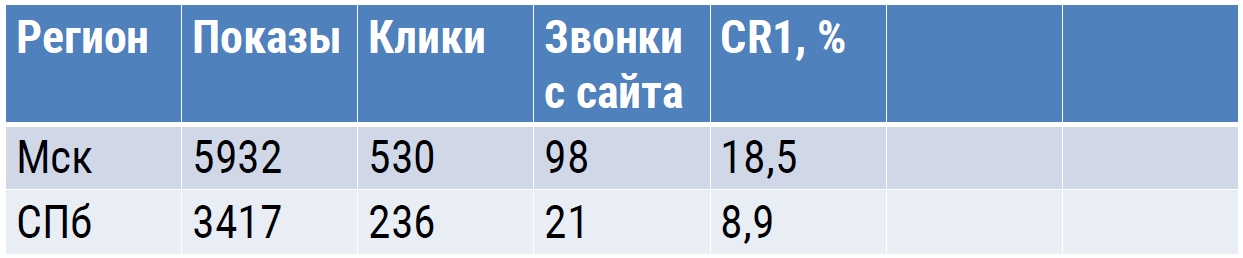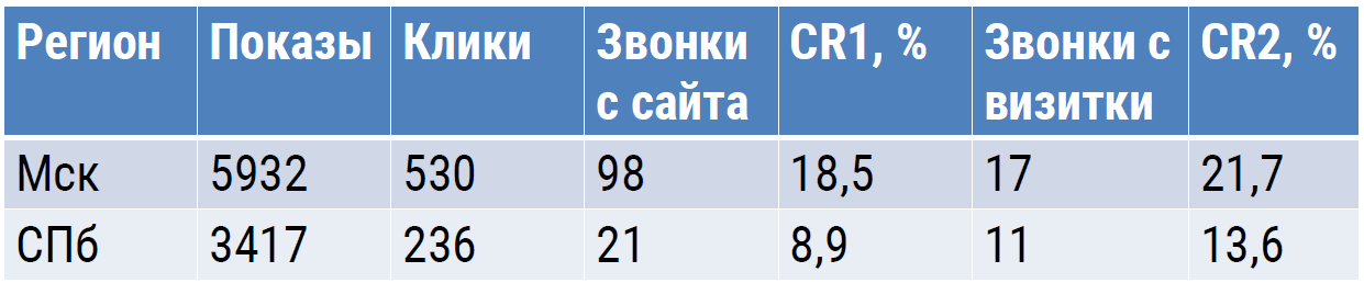 У рекламодателя было две рекламные кампании: для Москвы и Петербурга. Он считал уникальные звонки с сайта с помощью динамического коллтрекинга. Это был единственный способ коммуникации посетителей сайта с рекламодателем. Исходя из этого количества звонков с сайта, рекламодатель посчитал конверсию и максимальные ставки для кампаний.