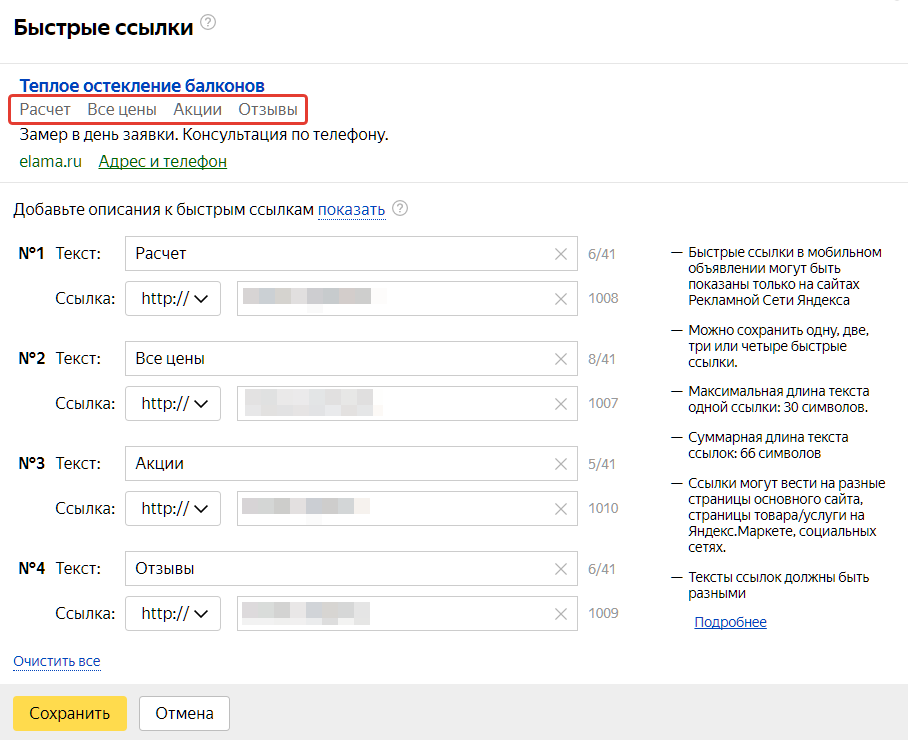 Следовательно, в оптимизированном мобильном объявлении делаем четыре короткие быстрые ссылки. Чтобы все четыре поместились на один экран, они должны состоять из 1-2 слов.