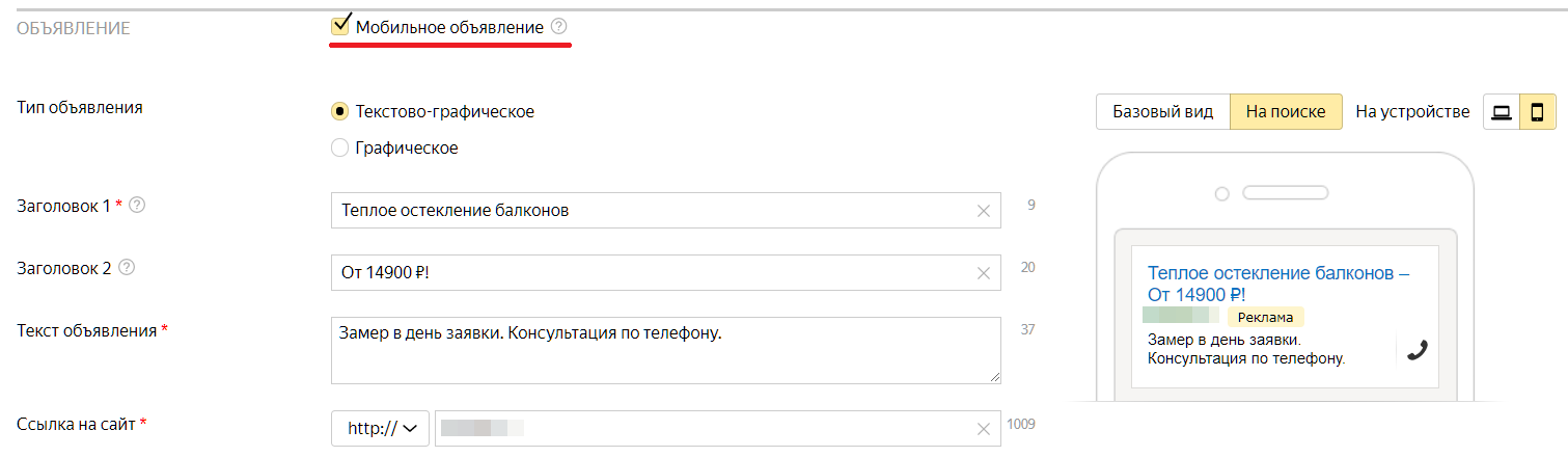 В Директе есть специальный чекбокс, который делает обычное объявление мобильным. Если создать такое объявление в группе, именно оно будет отрабатывать на смартфонах, остальные — на десктопах. Соответственно, ставим галочку «Мобильное объявление» у нужного варианта.