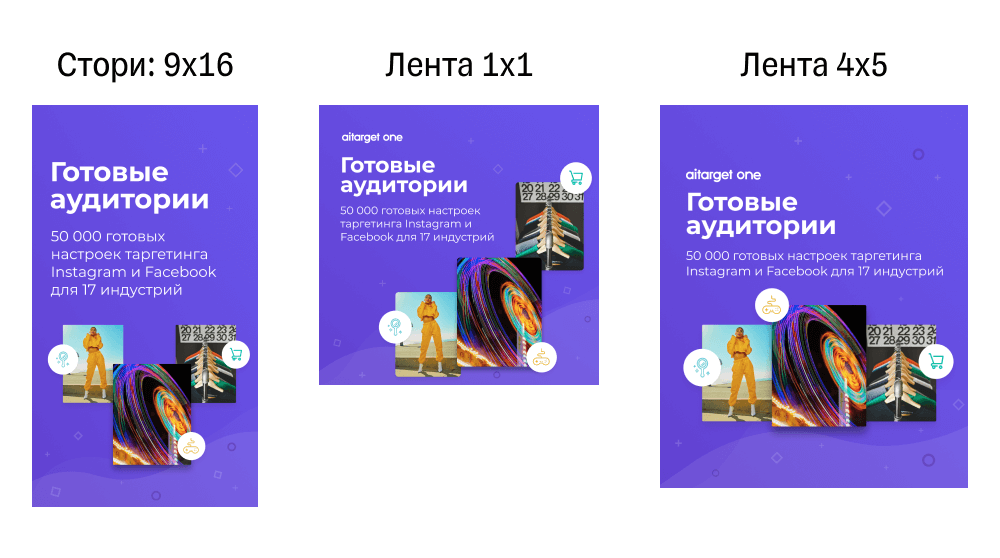 Есть два классических плейсмента для креативов в Фейсбуке и Инстаграме — лента и сторис. От них зависит, в каком формате делать креативы. Для сторис Instagram это 9×16, для ленты Facebook и Instagram — 1×1 или 4×5.