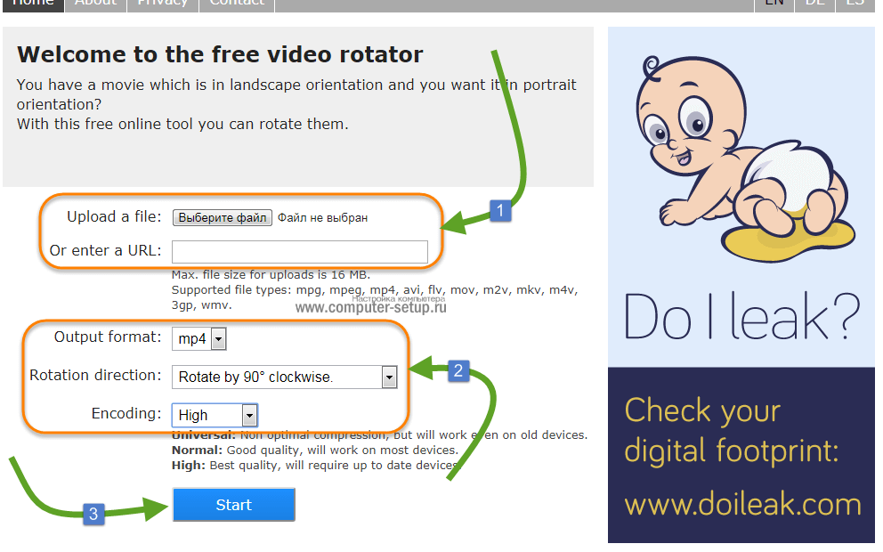 Один из наиболее популярных ресурсов для онлайн конвертирования видео в нужный вам формат, с возможностью поворота видео при конвертации — video.online-convert.com.