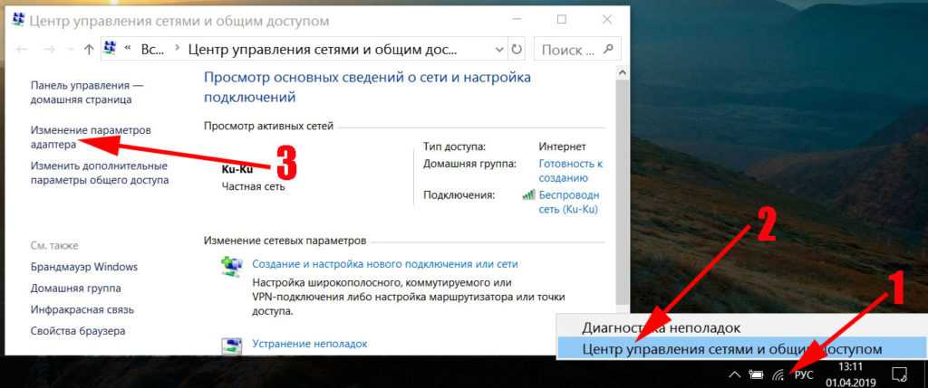 Клацаем на иконке «Сеть» ПКМ и выбираем «Центр управления…». Дальше в появившемся окне с левой стороны нажмите на строке «Изменить параметры адаптера».