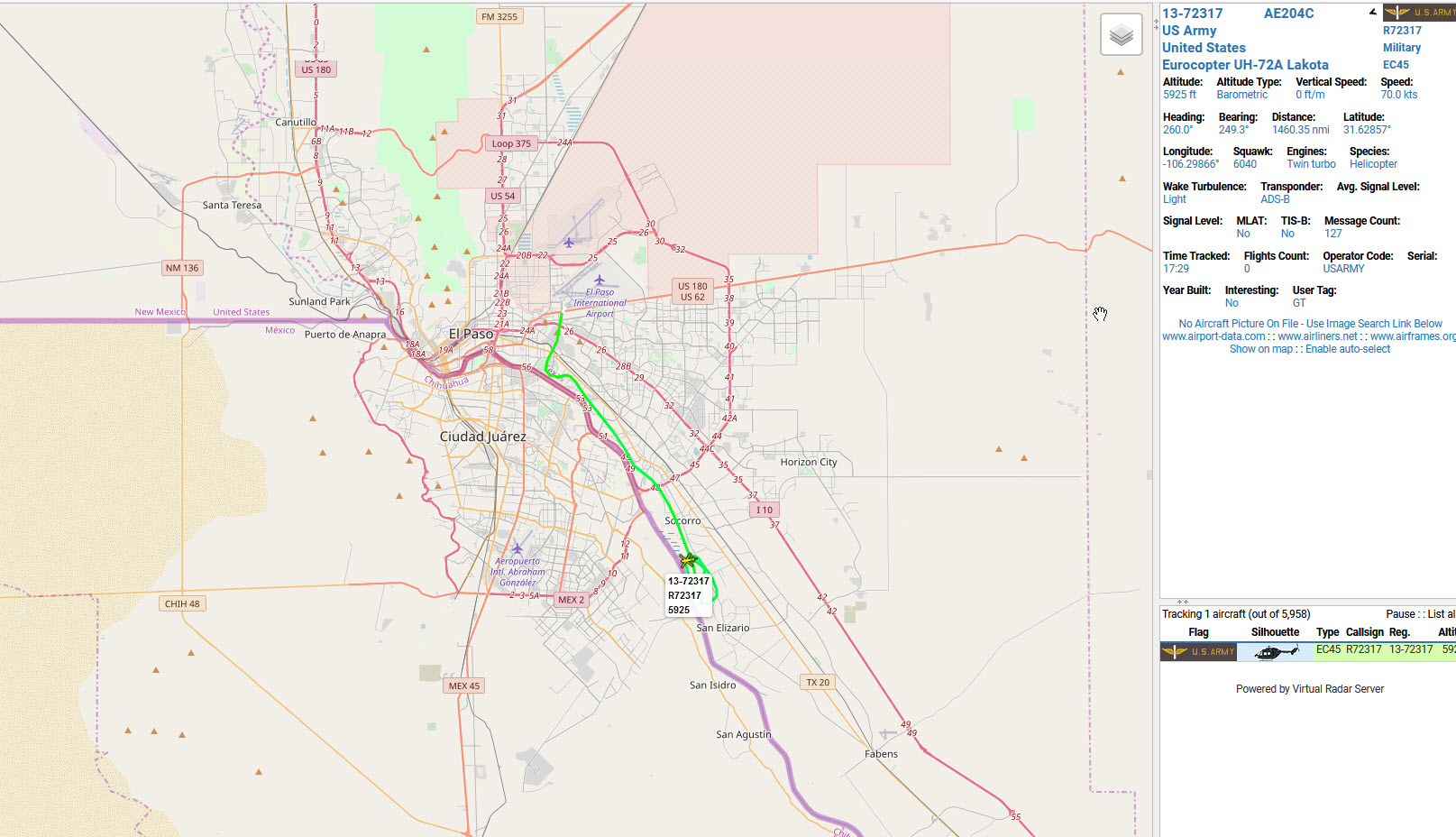 ADS-B Exchange также отслеживает некоторые военные самолеты. В данном случае отслеживается вертолет Армии США UH-72A Lakota, летящий недалеко от мексиканской границы к югу от Эль-Пасо, штат Техас.