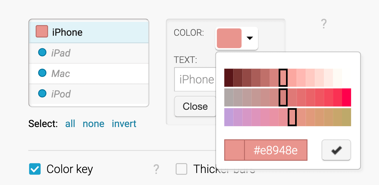 Родственником HSB/HSV является цветовое пространство HCL. Используются те же параметры (Hue, Chroma = Saturation, Lightness), но параметры ближе к тому, «как мы действительно видим цвета». Datawrapper использует цветовое пространство HCL для выбора палитры цветов:
