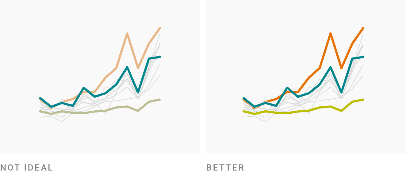 Зачастую, задача визуализатора заключается в том, чтобы некоторые цвета выделялись на фоне остальных. Есть разные способы добиться этого. Цвета становятся заметнее по разным причинам, например: