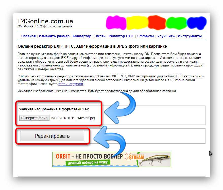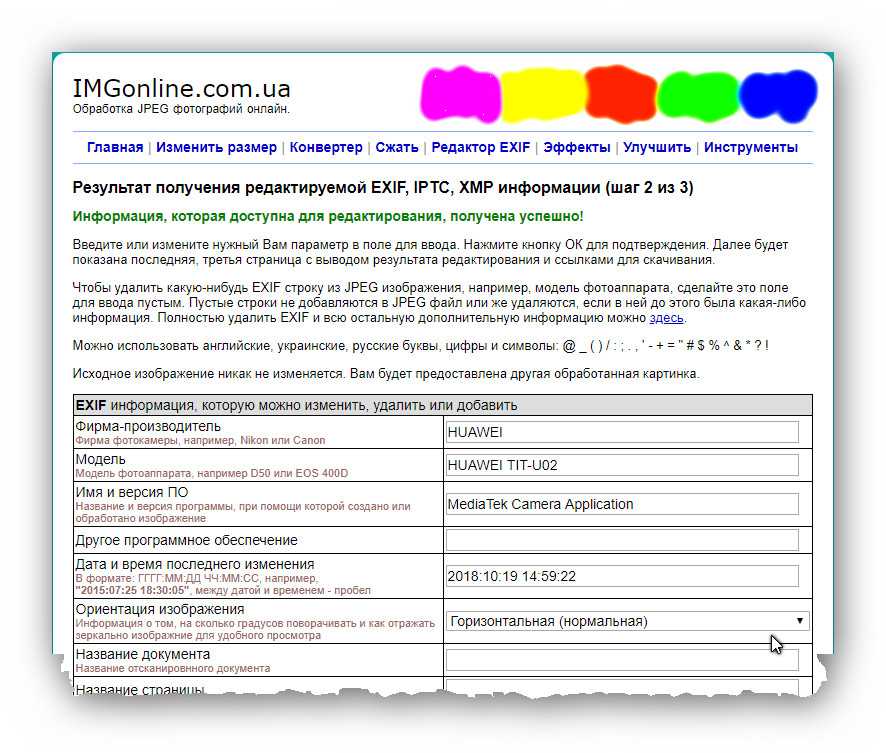 Отредактировать и прочитать данные EXIF можно с помощью онлайн сервисов. Один из них IMGonline.