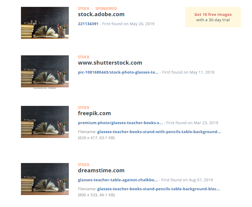 При клике расширение выдает все сайты, на которых используется изображение, а также похожие изображения