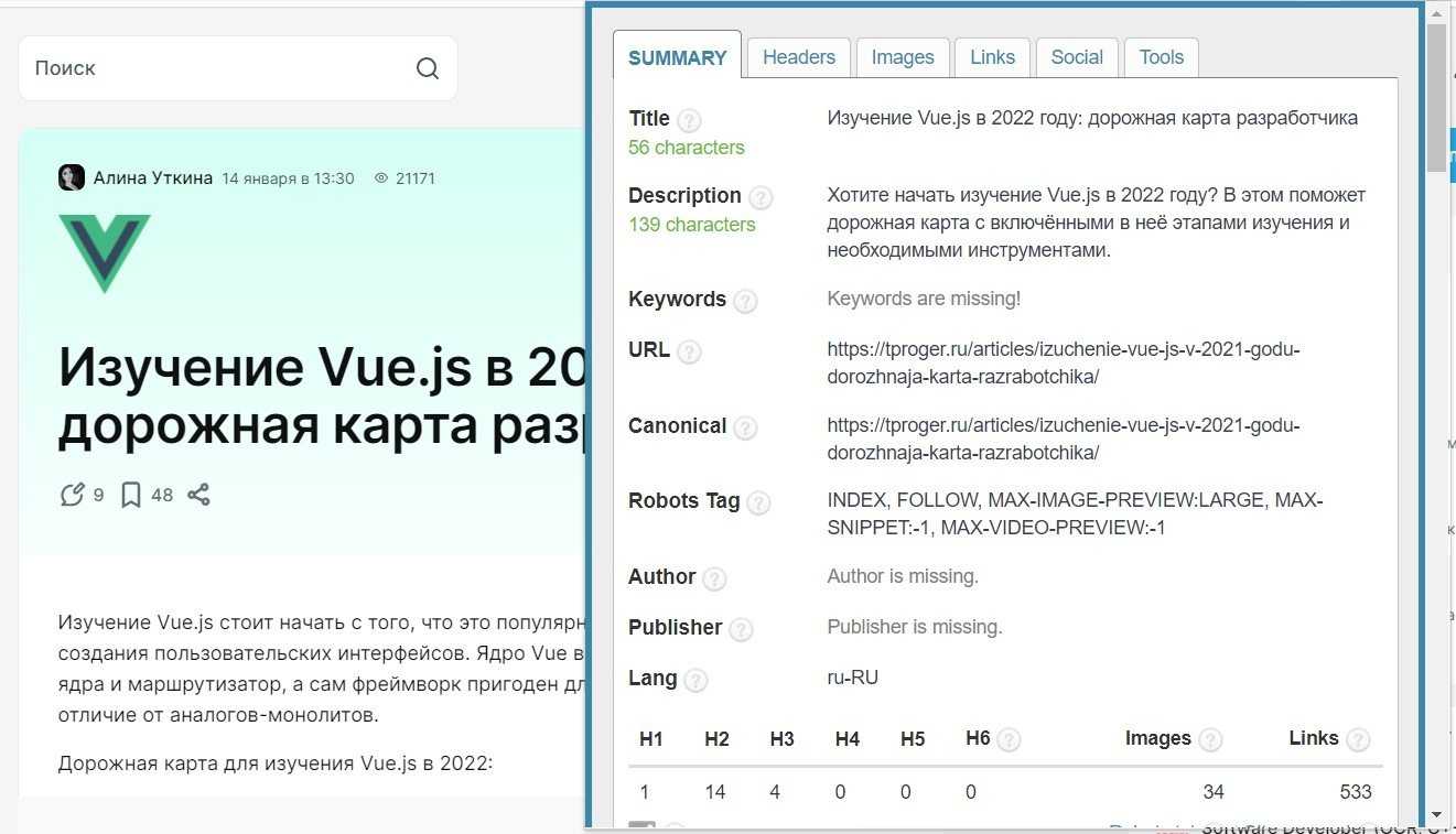 Помогает в проверке заполненности мета-тегов, правильного количества подзаголовков, альтов и тайтлов ссылок. Более подробный анализ покажет используемые на странице скрипты и значения атрибутов .