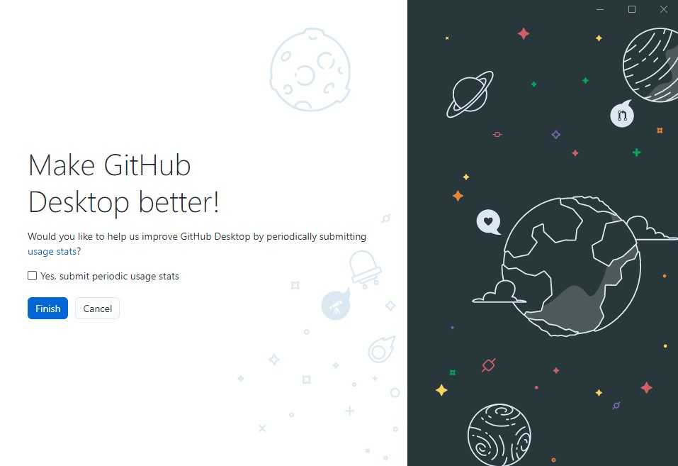 Отключаем пункт “Yes, submit periodic usage stats”, если не хотите периодически передавать статистику работы GitHub Desktop и нажимаем “Finish”