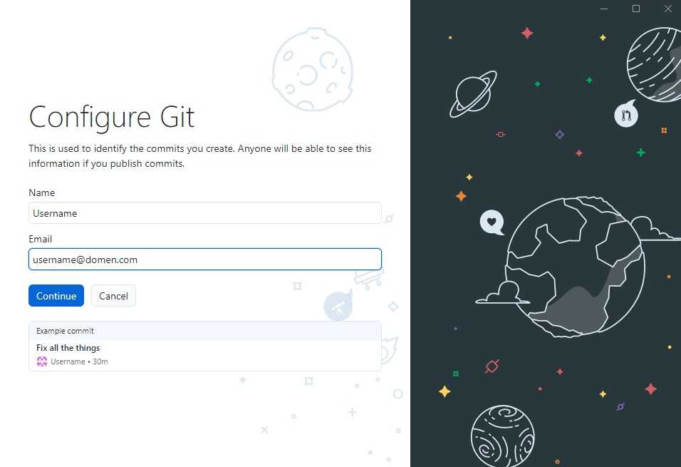 Далее регистрационные данные перенесутся в форму конфигурации (настроек) Git — нажимаем “Continue”