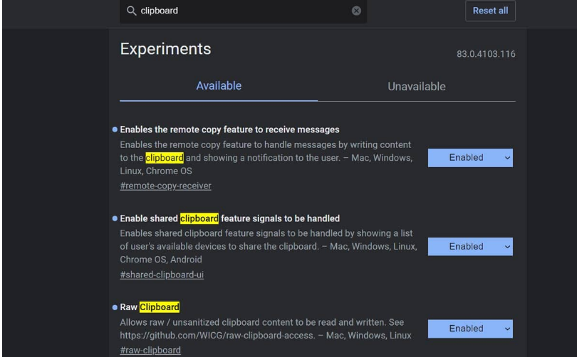 - В строке поиска «Флаги поиска» введите «clipboard» . На вкладке «Доступно» отображаются три флага: «Включает функцию удаленного копирования для получения сообщений» , «Включить обработку сигналов функции общего буфера обмена» и «Сырой буфер обмена» . Активируйте их все, выбрав «Включено» вместо «По умолчанию».