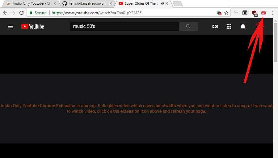 Так вот, после установки Audio Only YouTube значок программы автоматом появляется на панели расширения Chrome. После этого браузер начинает воспроизводить только аудио-компонент роликов с YouTube, при этом звучит аудиоролик точно так же, но загружается заметно быстрее.