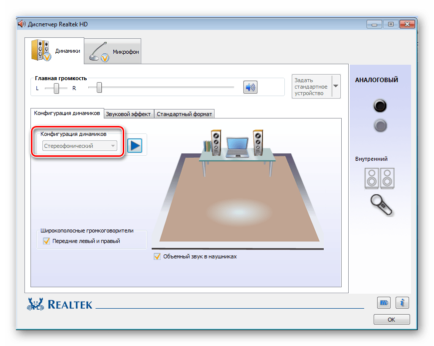 Во вкладке «Конфигурация динамиков» убедитесь в том, что выбран режим «Стереофонический».
