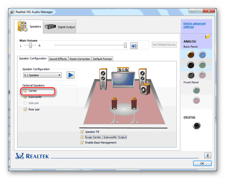 А если вы обладатель 5.1 динамиков, то вам необходимо отключить центральный громкоговоритель или попробовать также перейти в стереофонический режим.