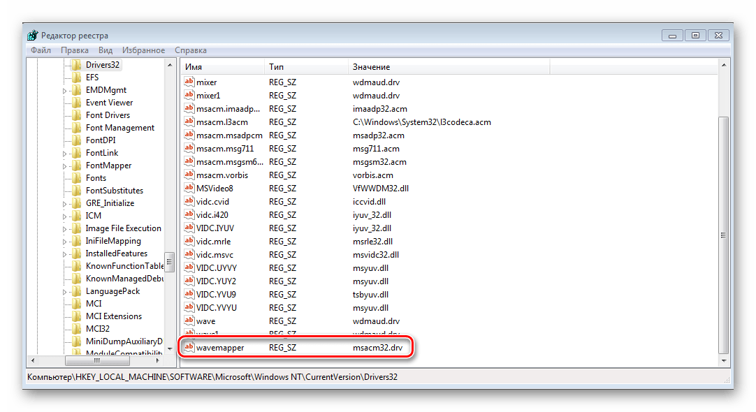 Найдите там имя «wawemapper», значение которого «msacm32.drv».