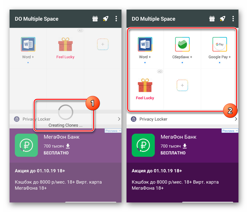 Данное ПО, являясь одним из многих, позволяет клонировать любые установленные на телефоне приложения, начиная от социальных сетей и заканчивая играми. Здесь поддерживается одновременное использование нескольких аккаунтов, но даже при этом и с высоким рейтингом в магазине, ПО содержит немало рекламы, удаляемой только путем приобретения VIP-подписки и активации соответствующего параметра в настройках.
