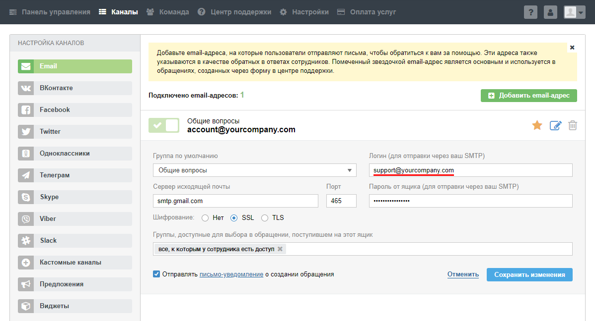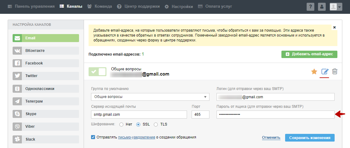 7) Откройте окно редактирования подключенного ящика в Омнидеске и вставьте полученный пароль приложения в поле «Пароль от ящика». В полях «Сервер исходящей почты», «Порт» и «Шифрование» укажите значения со скриншота и сохраните изменения.