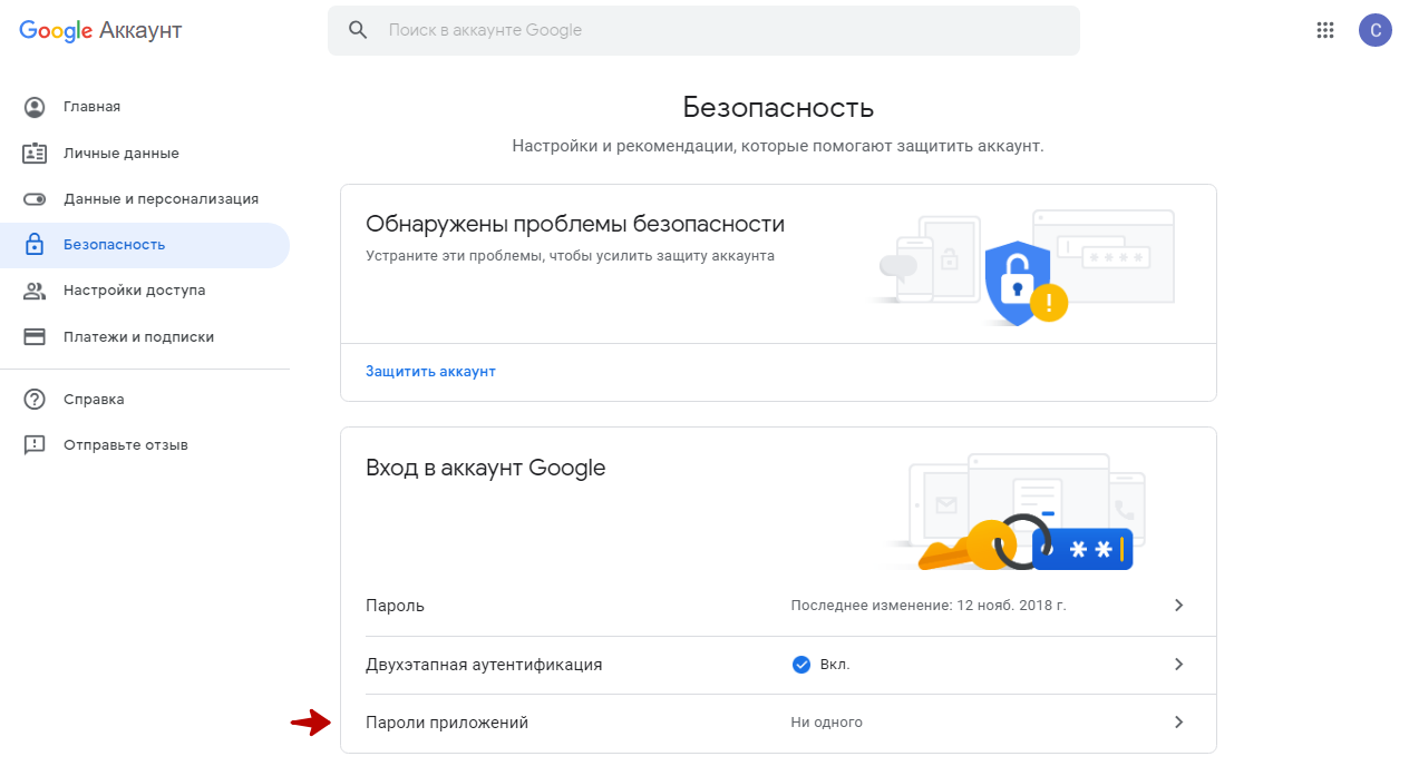 3) Вернитесь в раздел «Безопасность» и перейдите в пункт «Пароли приложений».