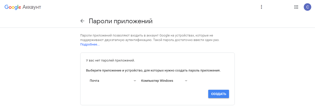5) На открывшейся странице, в пункте «Приложение» выберите «Почта», а в пункте «Устройство» выберите «Компьютер Windows» или «Mac» в зависимости от того, что вы используете.