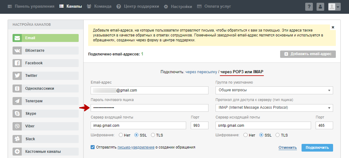 6) Вставьте полученный пароль приложения в поле «Пароль почтового ящика» в форме подключении ящика к Омнидеску. В полях «Сервер исходящей почты», «Порт» и «Шифрование» укажите значения со скриншота и нажмите «Подключить».