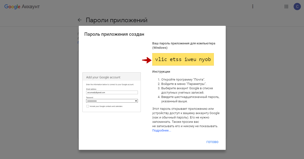 6) В открывшемся окне скопируйте полученный пароль приложения.