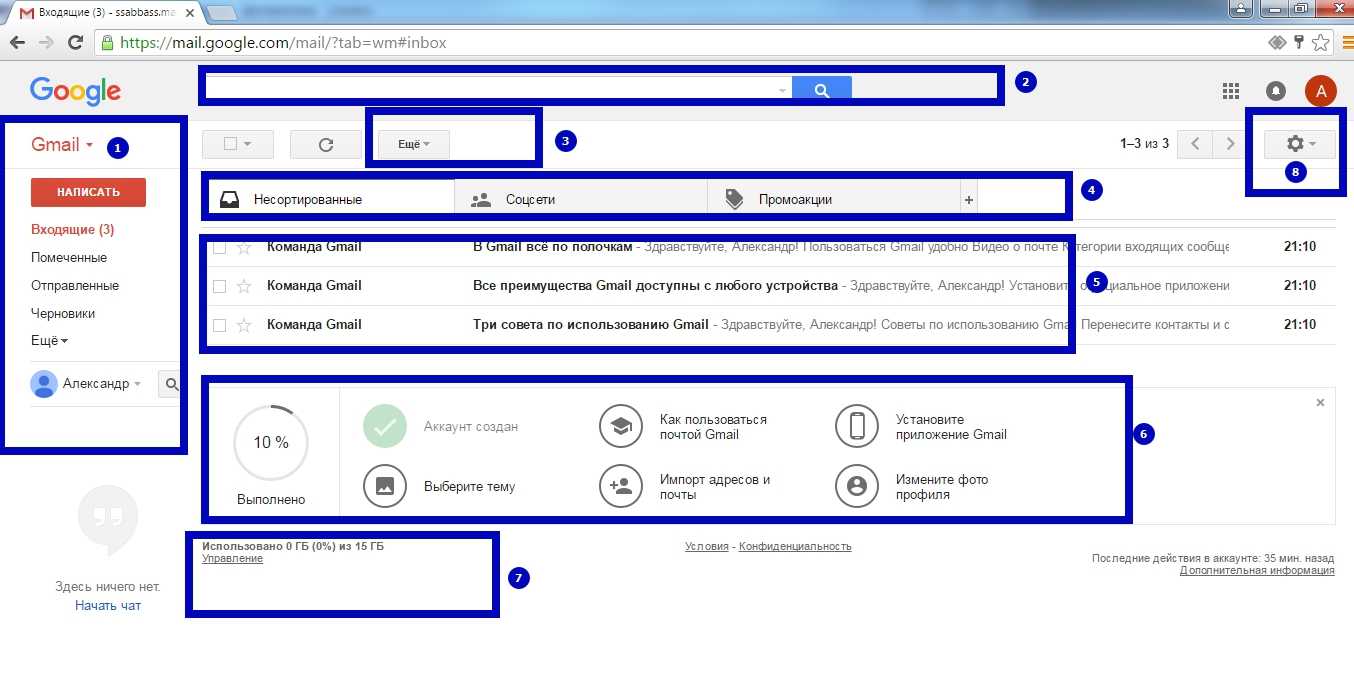 - – Список входящих писем. Поскольку мы только-только создали почту, то все эти письма от Google. Кстати, прочтение писем поможет вам разобраться с возможностями и настройками Gmail.