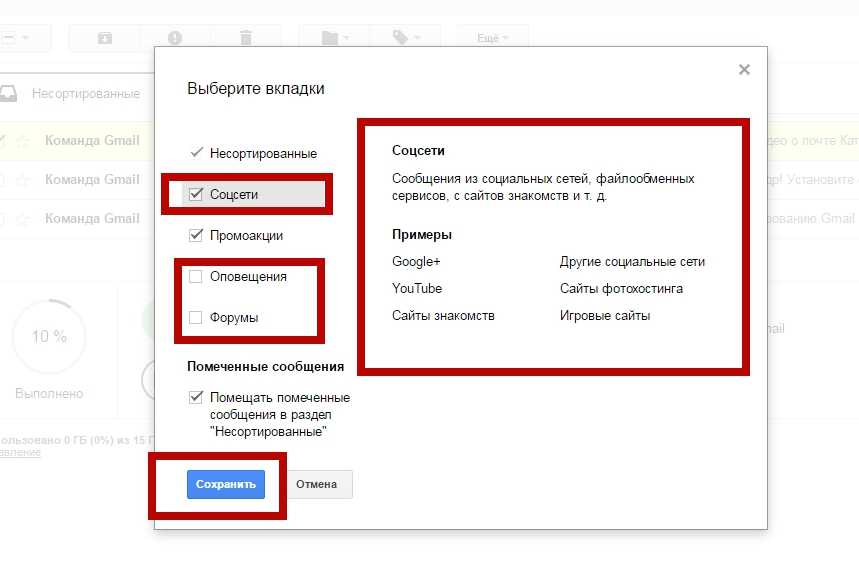 - – Вкладки разделения корреспонденции. По умолчанию входящие письма делятся на «Несортированные», «Соцсети», «Промоакции». Если нажать здесь на знак плюса «+», то можно добавить вкладки «Оповещения», «Форумы». По каждой закладке приводится грамотное пояснение. Например: